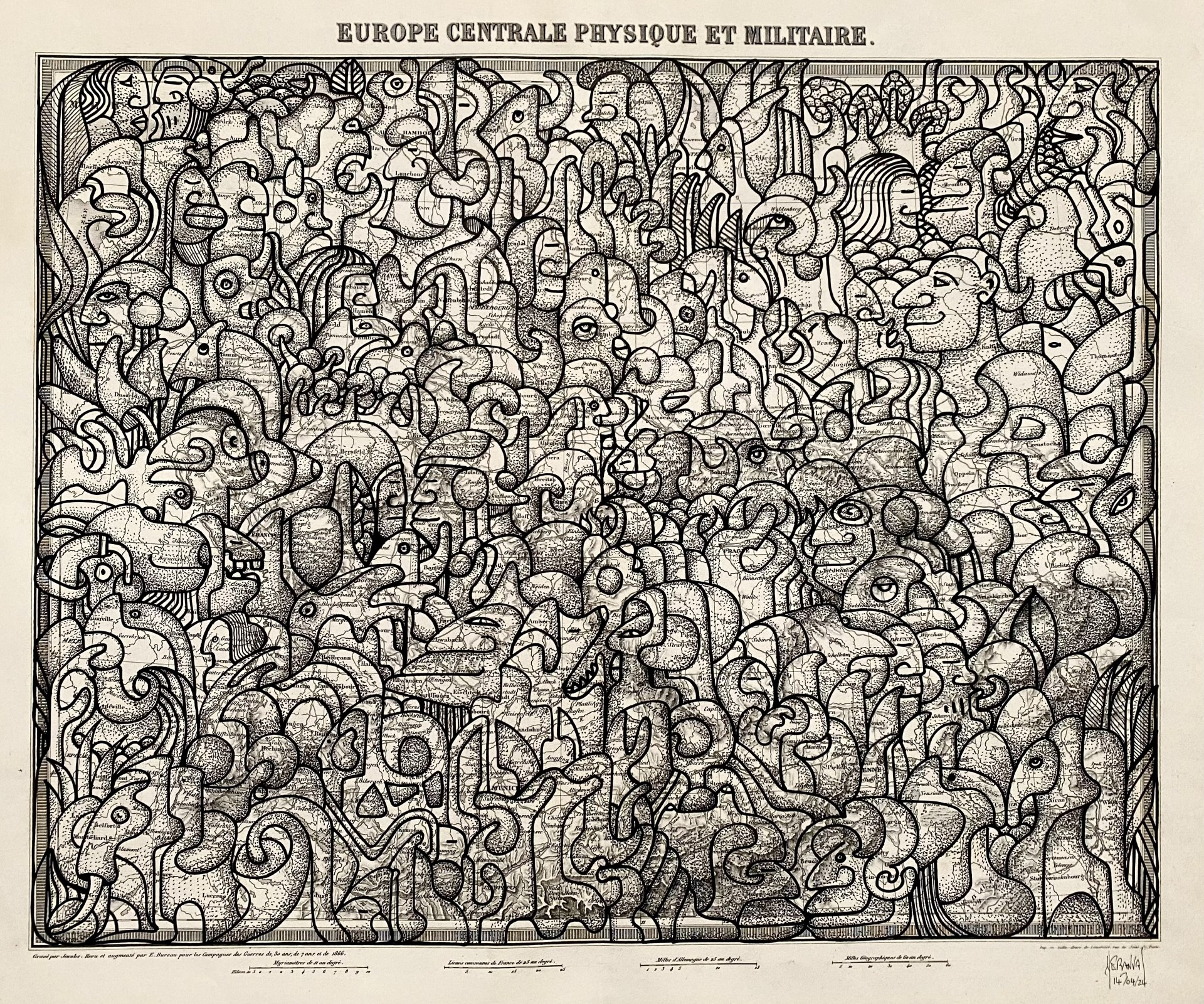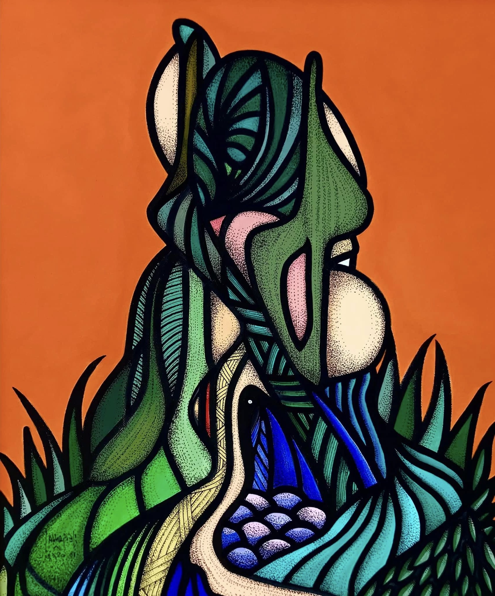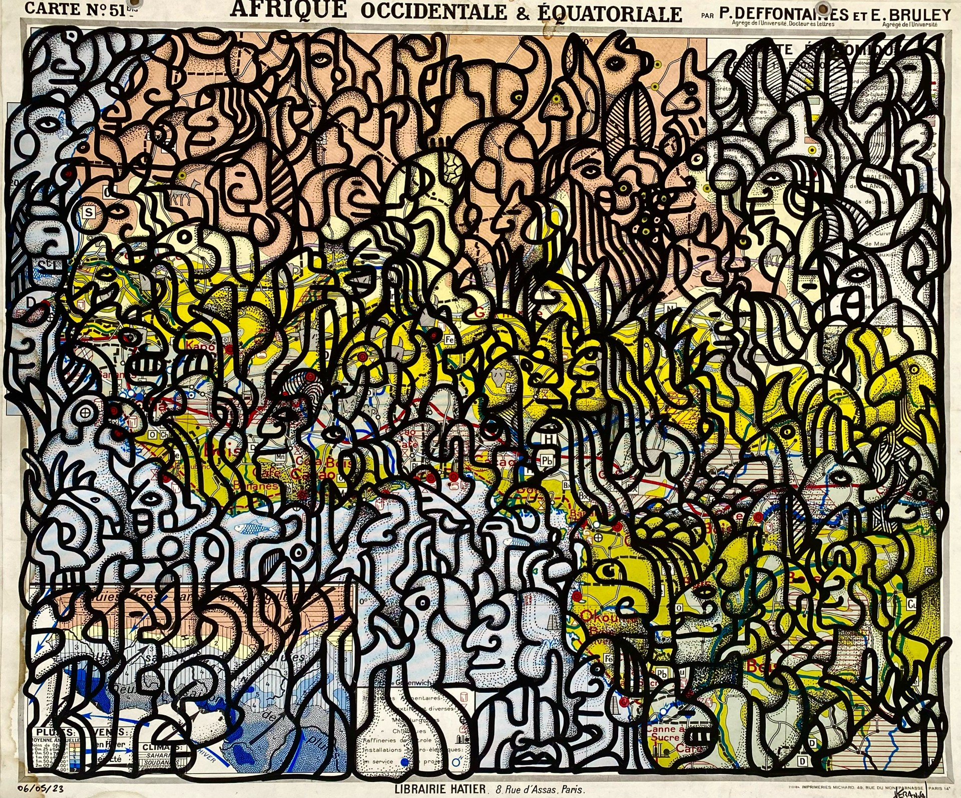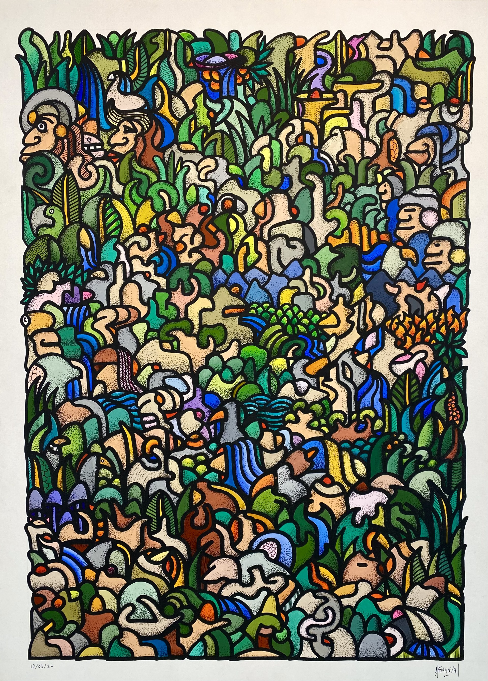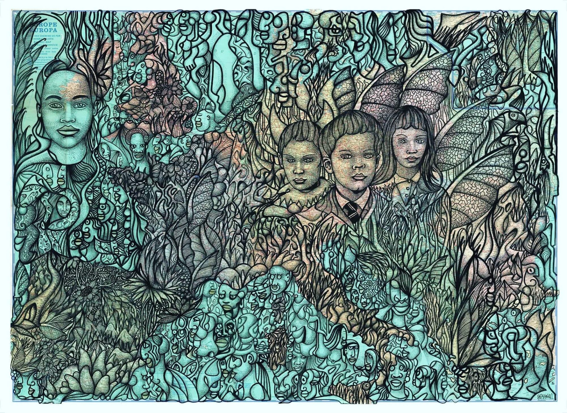 Pascal Héranval (né en 1958) est un artiste peintre, musicien et réalisateur français. Il a vécu quatorze ans à Salvador, dans l’État de Bahia au Brésil, où il découvre la peinture naïve et l’imagerie populaire du Nordeste. Il suit les cours de gravure du Musée d’Art Moderne de Bahia de 1999 à 2001. C’est durant cette période qu’il commence à peindre et à exposer. Son travail s’inscrit dans le courant de la figuration libre et de l’art singulier. Il travaille principalement à l’encre sans esquisse préalable, avec pour support de prédilection les cartes géographiques, le bois, la toile ou le papier. Son œuvre est nourrie par les arts vernaculaires, la peinture naïve et les arts premiers. À la manière d’un graveur, il compose des figures humaines et animales dans des décors végétaux, bâtissant un étrange abécédaire de pictogrammes colorés et lumineux. Il explore le dessin, la musique et le cinéma expérimental. Il vit aujourd’hui à Vence, sur la Côte d’Azur, et expose régulièrement en France et à l’étranger.